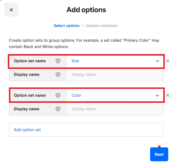 - Name your option (e.g., Size, Color, etc.).