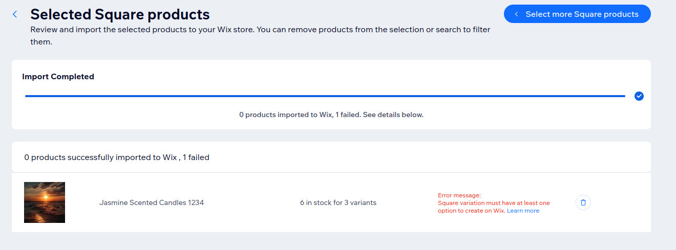 When importing products from Square to Wix, you may encounter the following error: